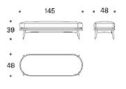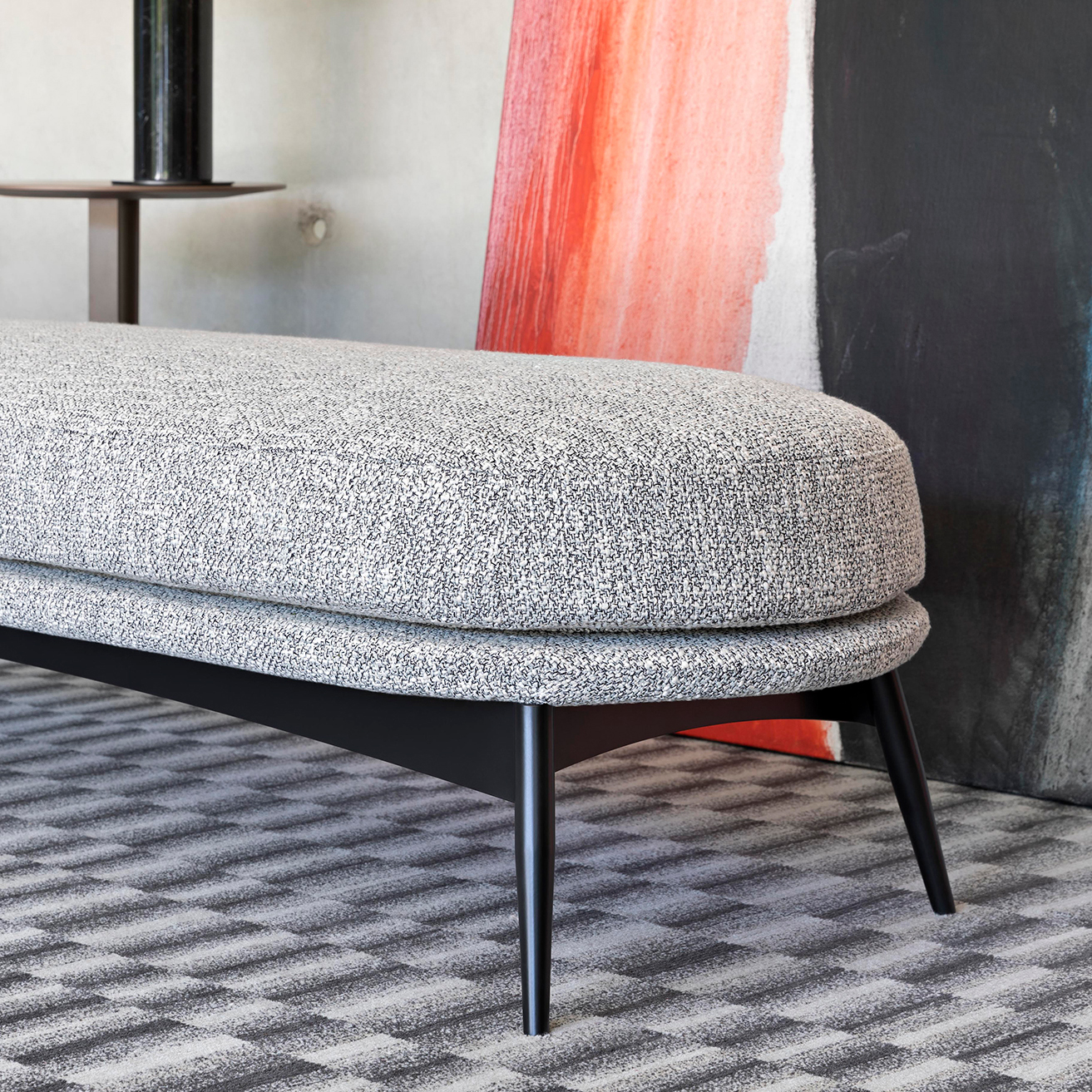 Curbele asimetrice care îl înconjoară sunt inspirațiile pentru fotoliul Oltremare care completează colecția alături de o bancă căptușită.